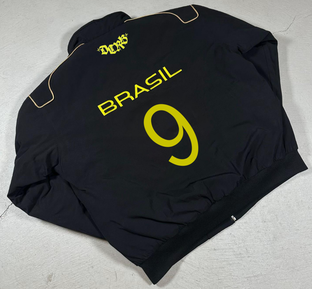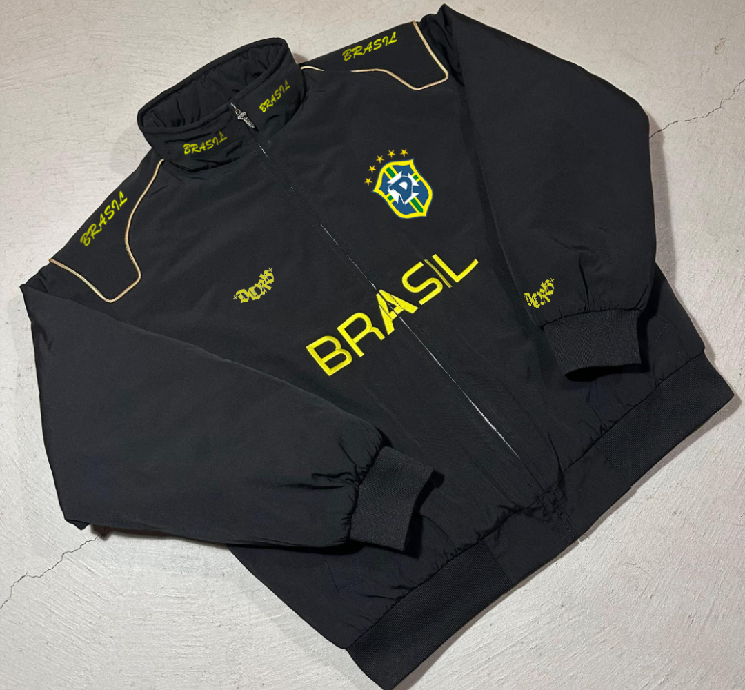 The DCRB “Brasil 9” Track Jacket draws inspiration from the golden era of Brazilian football, reimagined through a raw, streetwear lens. Crafted in sleek black with bold yellow accents, the jacket features the iconic “BRASIL” embroidery across the chest, a reworked CBF-inspired crest, and the legendary number 9 — a nod to the strikers who defined generations.