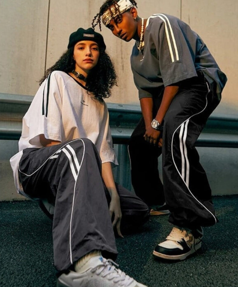 Bold side stripes energize relaxed wide-leg silhouette.